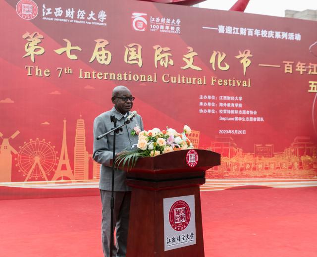 On the afternoon of May 20th, the 7th International Cultural Festival hosted by Jiangxi University of Finance and Economics and undertaken by Overseas Education School was successfully held. Dr. Martin Chedondo, Ambassador of the Republic of Zimbabwe to China, Counselor Perez Kavocha, and Counselor Lenglet Mozapo were invited to attend. President Deng Hui delivered the opening speech, and Vice President Liu Xiaoli announced the opening. The heads of relevant units and nearly 2,000 Chinese and foreign teachers and students from 65 countries gathered to celebrate the grand event.